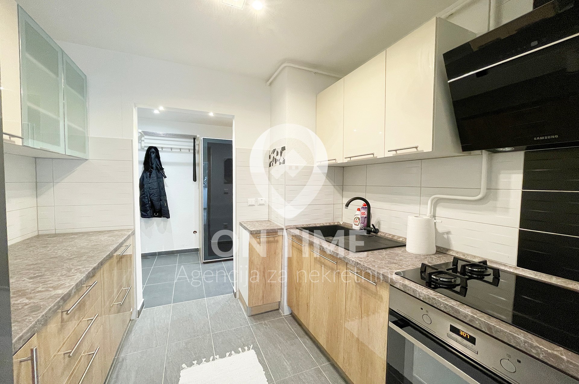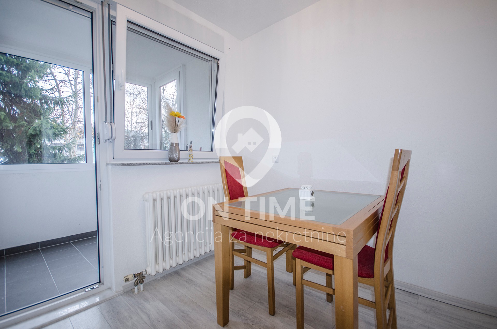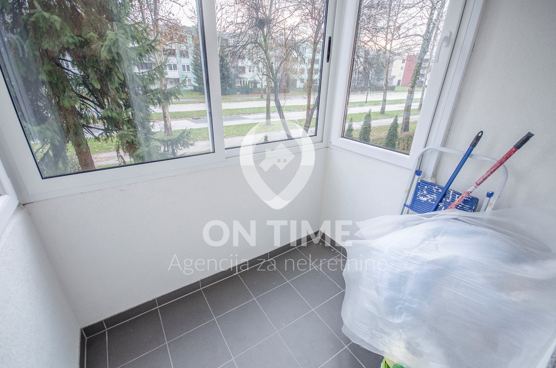 Podni dijelovi su laminat u dnevnom boravku i trpezariji, keramičke pločice su u kuhinji, kupatilu, predsoblju i balkonu.