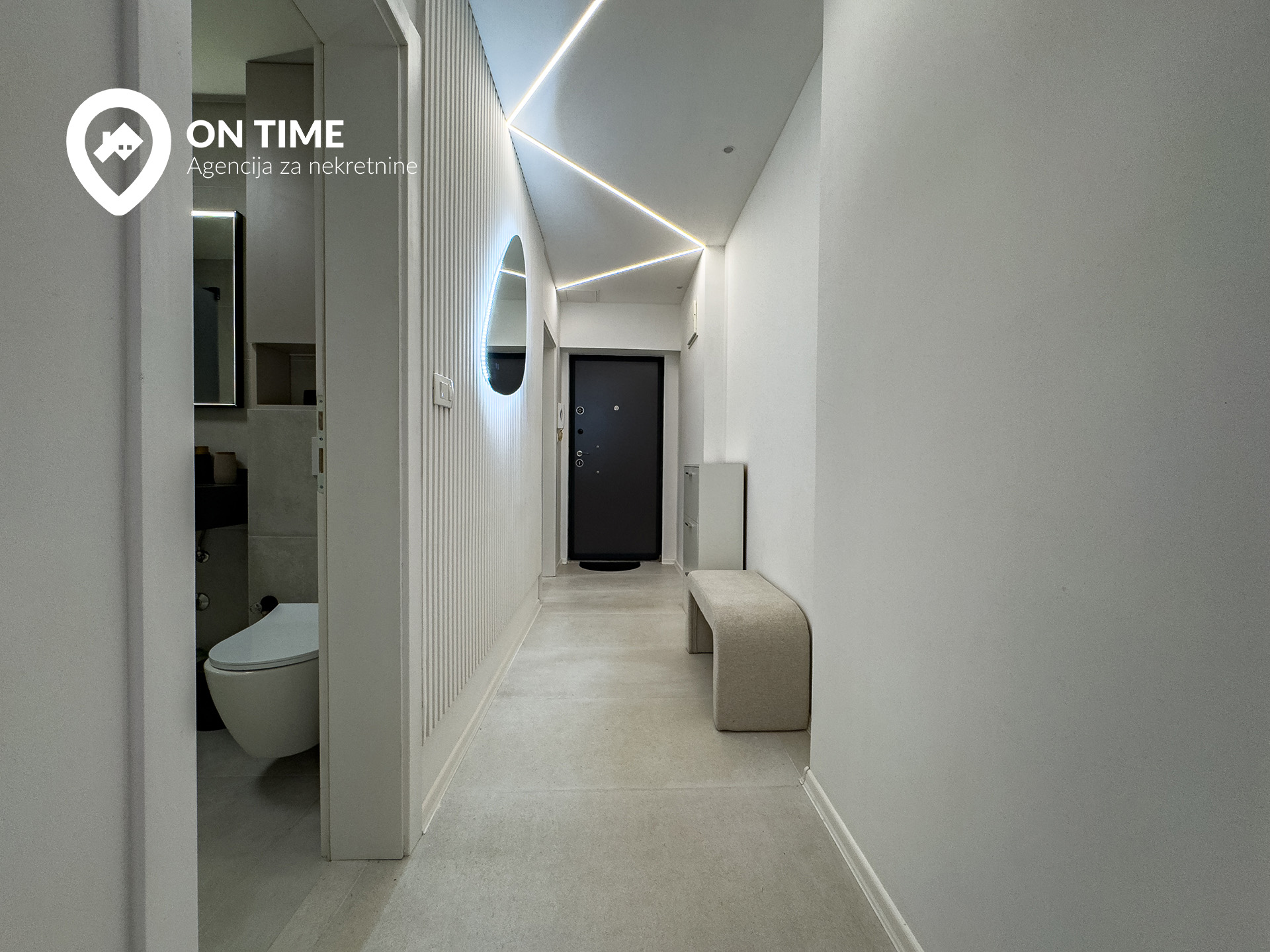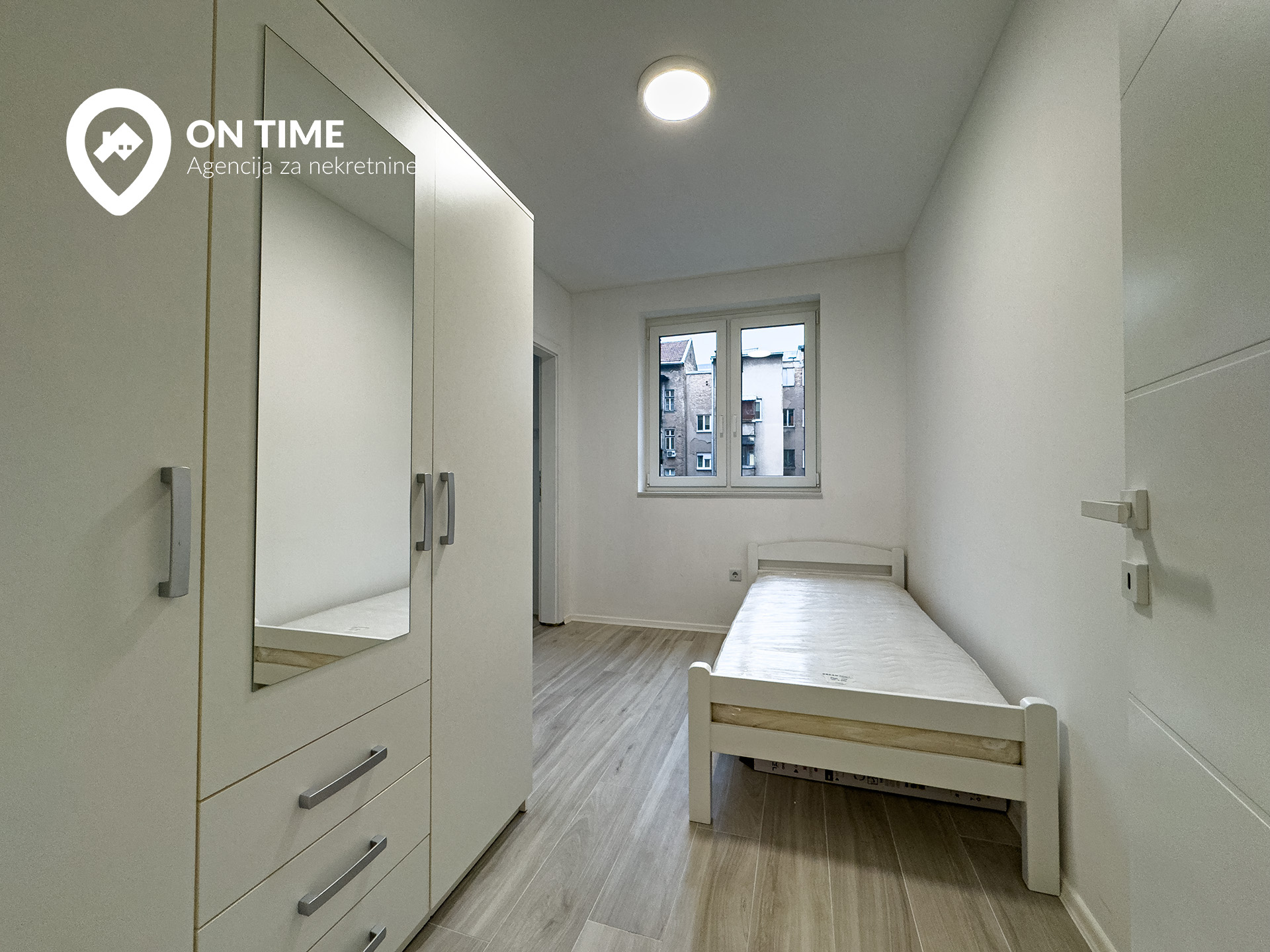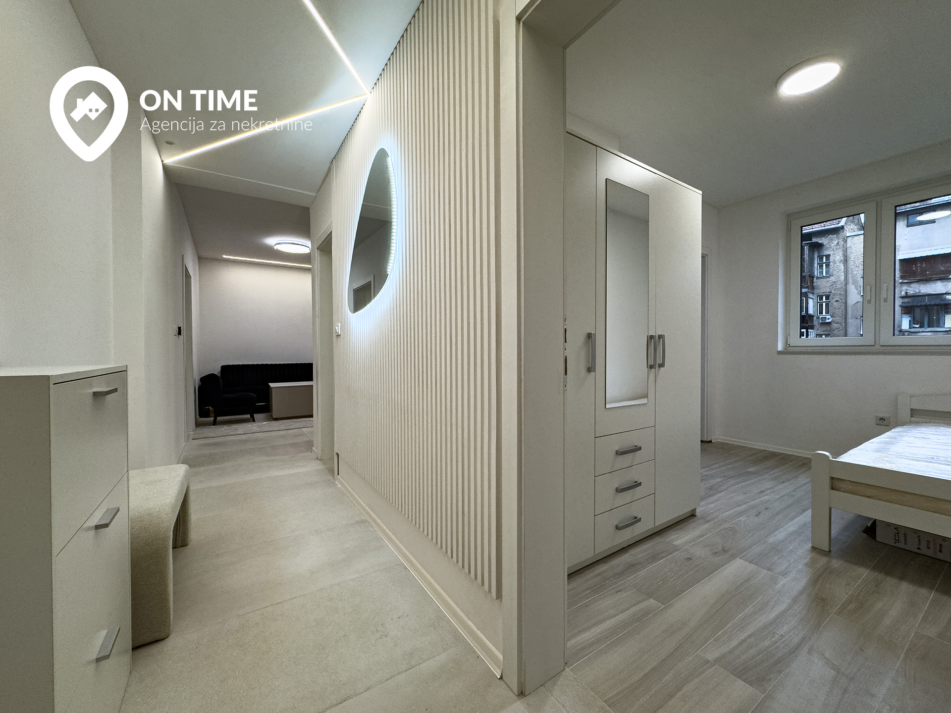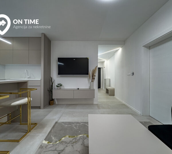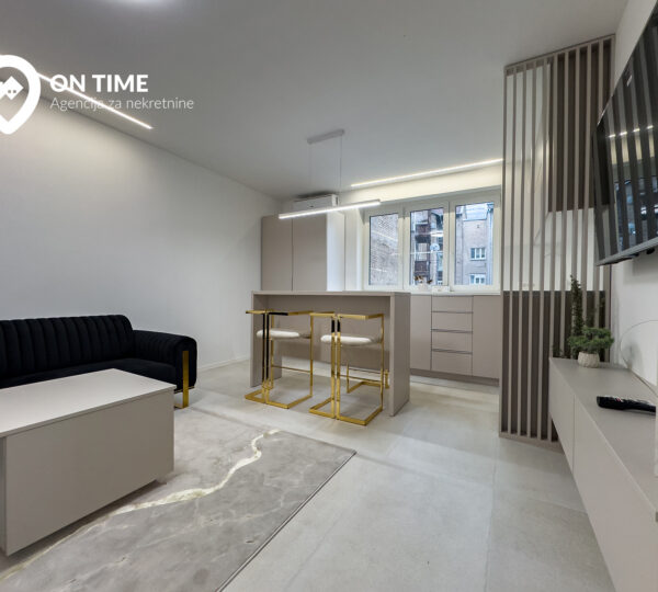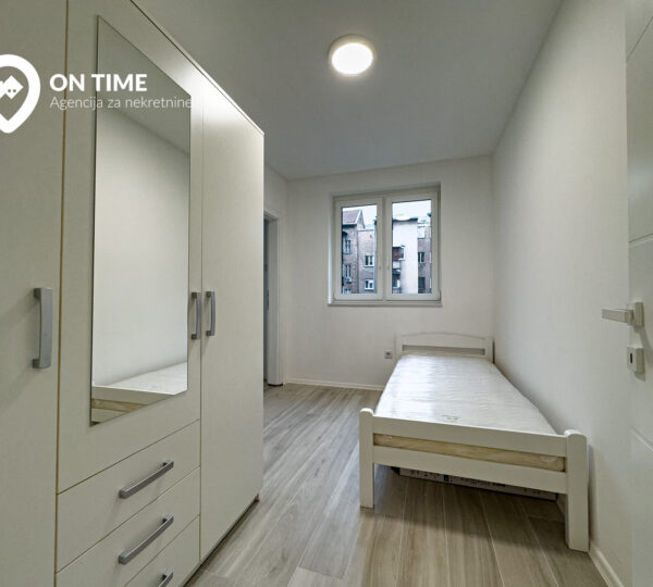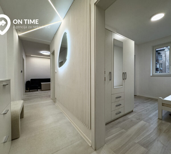 Stan je temeljito renoviran prije nekoliko mjeseci i opremljen najmodrenijim namještajem i tehnikom, te su promijenjene sve elektro i vodoinstalacije. Stan čine sljedeće prostorije: Ulazni hodnik; Dnevni boravak sa trpezarijom i kuhinjom; Veća spavaća soba sa garderoberom; Manja dječija soba; Ostava i kupatilo. Stan se prodaje potpuno namješten, uključujući ugradbeni i pokretni namještaj i električne uređaje. Parking iza zgrade, dostupan stanarima (skoro uvijek slobodan prema riječima vlasnika). Vrijedi napomenutni da je stan dvostrano orijentisan.