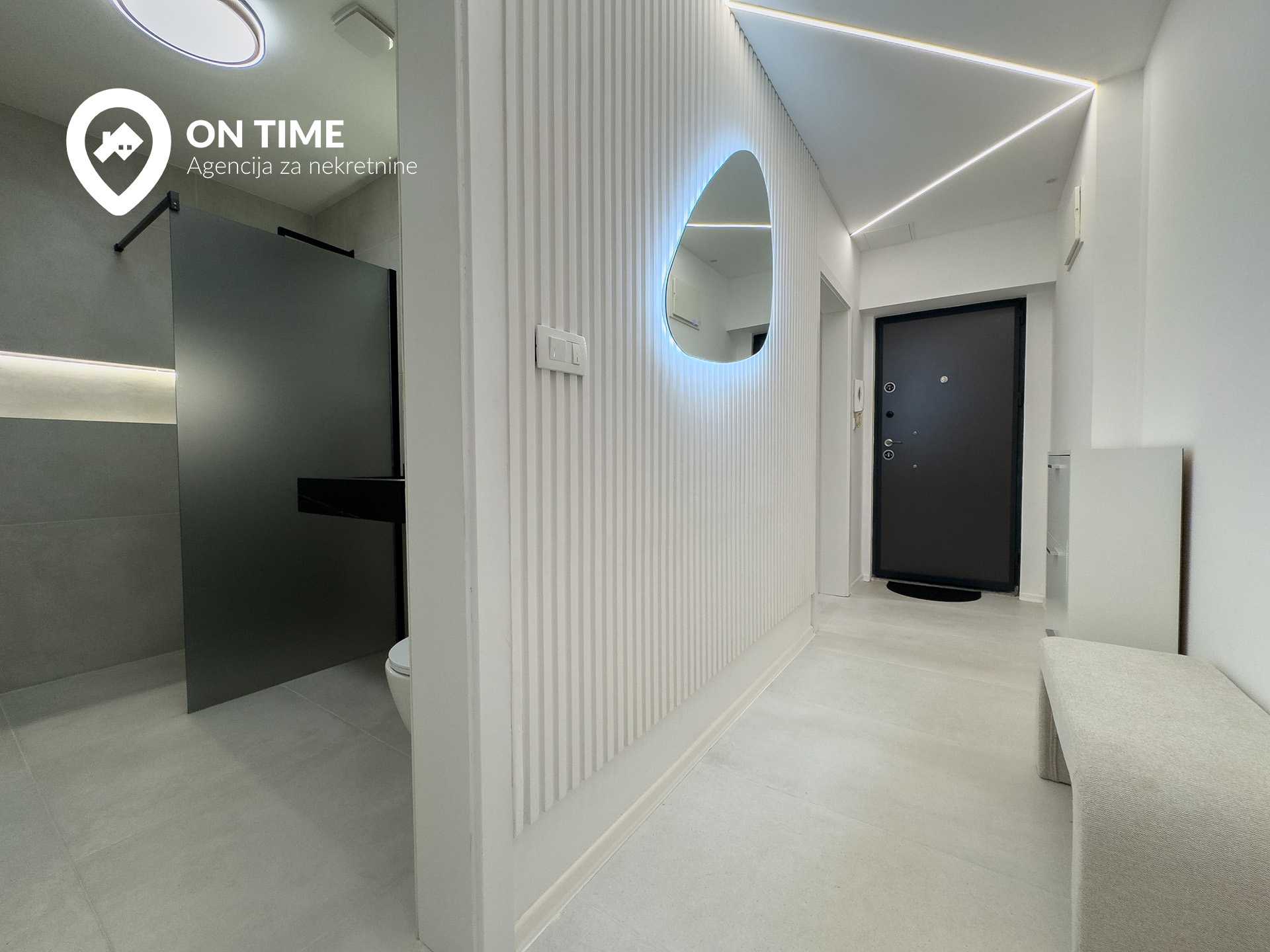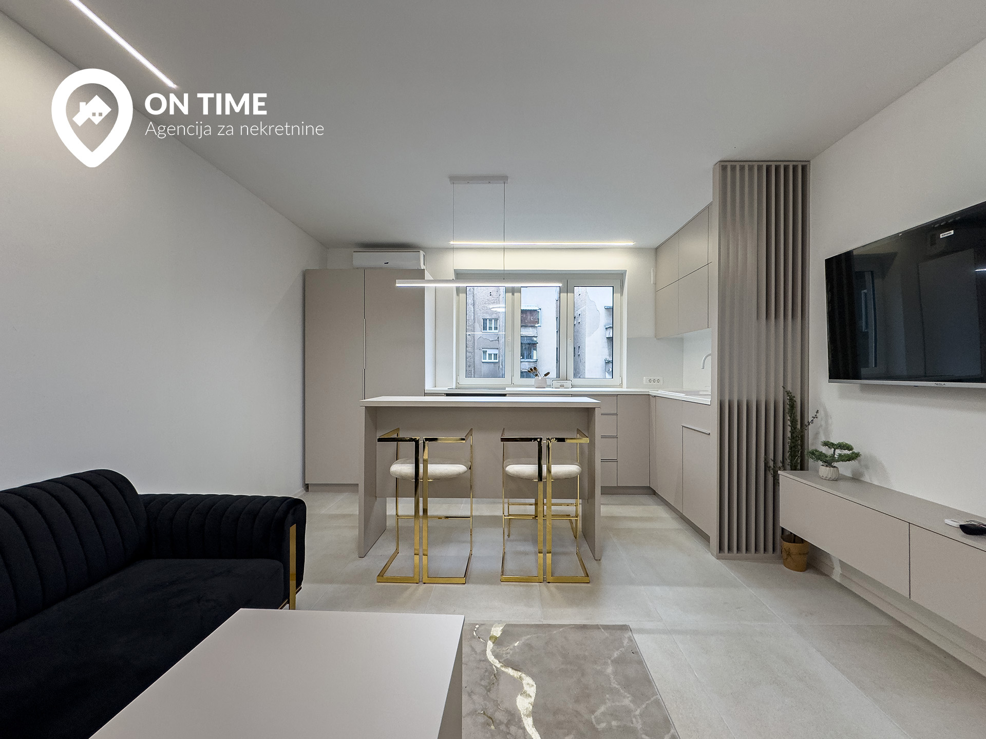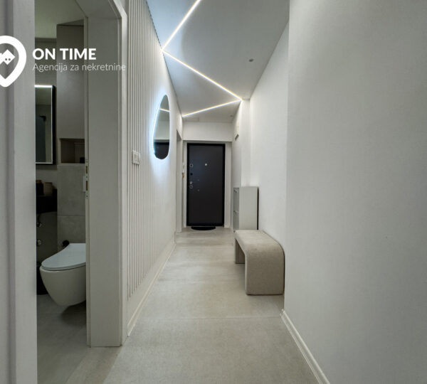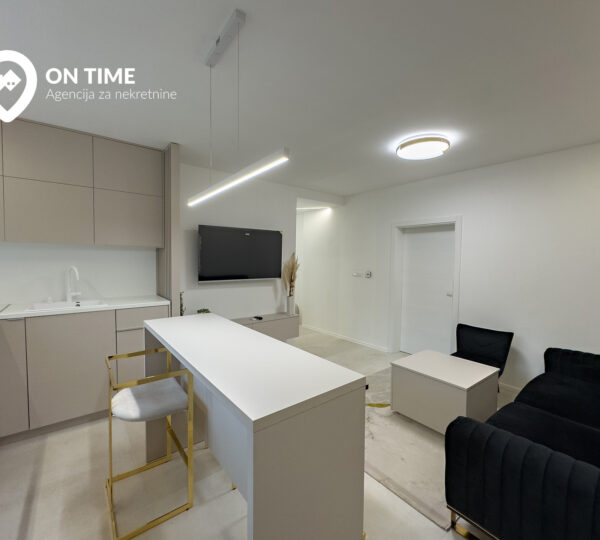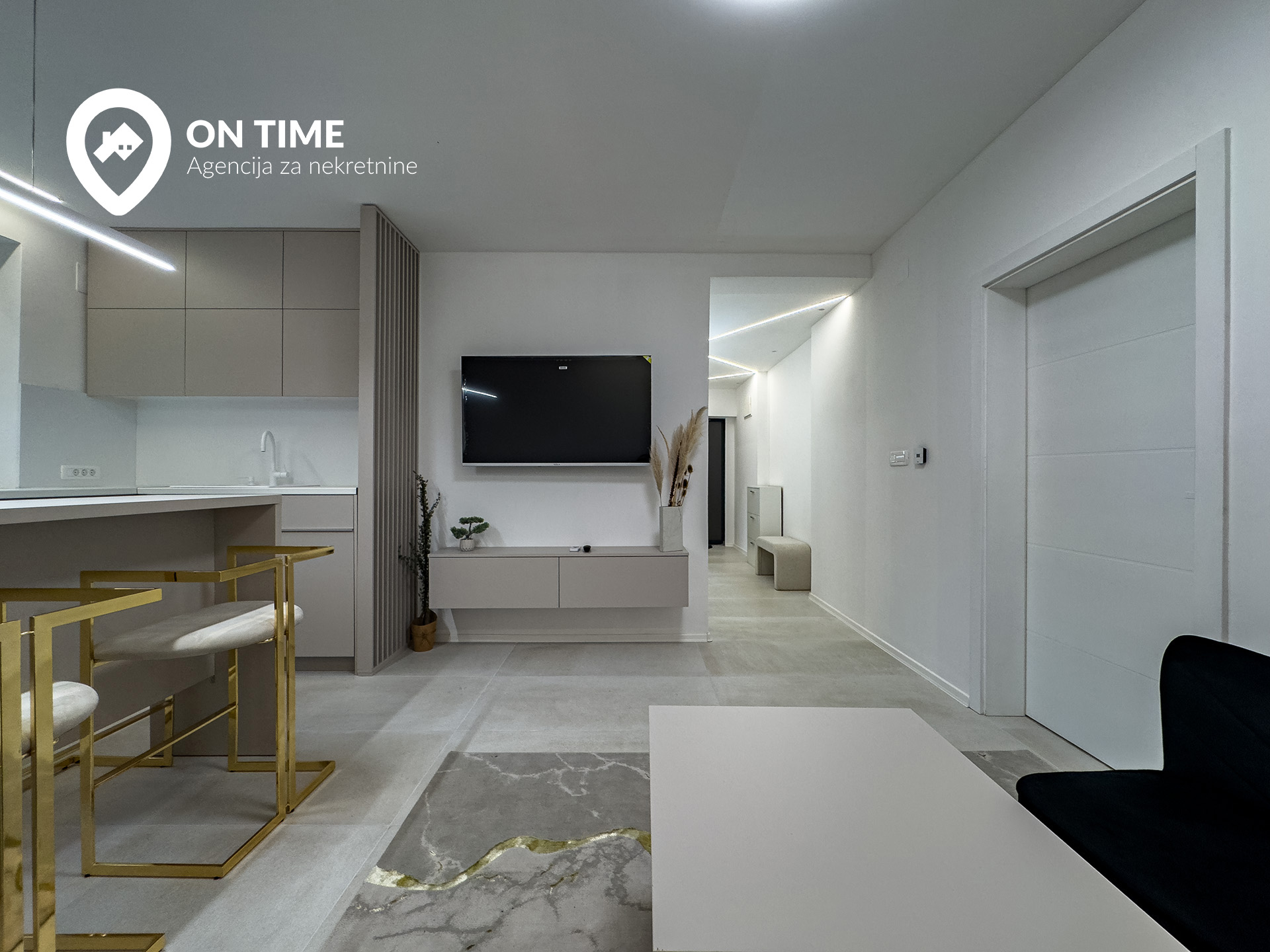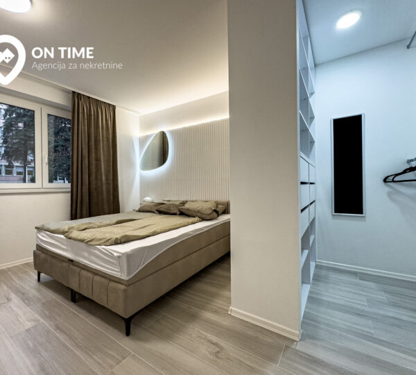Stan je temeljito renoviran prije nekoliko mjeseci i opremljen najmodrenijim namještajem i tehnikom, te su promijenjene sve elektro i vodoinstalacije. Stan čine sljedeće prostorije: Ulazni hodnik; Dnevni boravak sa trpezarijom i kuhinjom; Veća spavaća soba sa garderoberom; Manja dječija soba; Ostava i kupatilo. Stan se prodaje potpuno namješten, uključujući ugradbeni i pokretni namještaj i električne uređaje. Parking iza zgrade, dostupan stanarima (skoro uvijek slobodan prema riječima vlasnika). Vrijedi napomenutni da je stan dvostrano orijentisan.